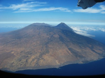 Der Pico do Fogo ist ca. 2829 m hoch, der höchste Berg der Kapverden, der grösste aber nur der zweithöchste aktive Vulkan im Atlantik. Der letzte Ausbruch war 1995. Am 14.12.2007 besteigen wir ihn, der Aufstieg ist anstrengend, der Abstieg über ein steiles feines Schlackenfeld geht rasch und wenn man den Fehler begeht, sich einmal niederzusetzen, findet man die Schlacke bis zur Unterhose überall wieder.