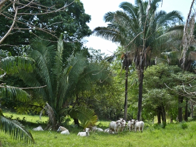 Pferde und Rinder friedlich vereint auf der Weide unter Palmen, das ist doch wirklich richtig netter Anblick.