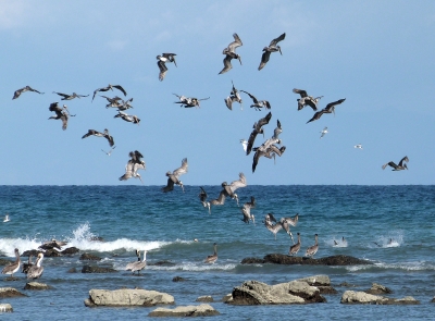 Die Pelikane zeigen, wo die Fische zu finden sind, hoffentlich lassen sie uns noch ein paar übrig.