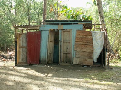 Die Duschen: Ein Plastikfass mit Wasser, zwei abgeschnittene Plastikflaschen und schon kann man sich mit Wasser übergiessen. Die Gebäude sehen auch ein wenig wackelig aus, aber wenn man sich nicht zu ungestüm bewegt, werden sie schon nicht umfallen. Den Zweck erfüllen sie allemal.