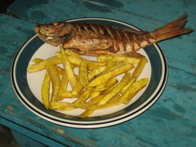 In der Nähe gibt es drei Restaurants. Zwei davon würde man in Europa nicht so nennen. Aber gerade diese zwei haben das beste Essen zu bieten. In der Hauptsache gibt es frischen Fisch, Shrimps, Patacones und Yuca. Sehr, sehr lecker!